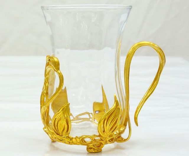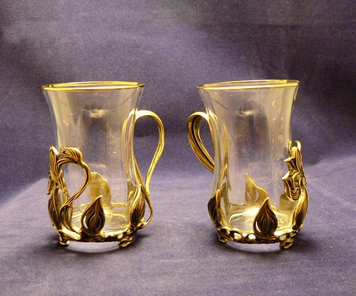 Los posavasos están hechos de latón y esmalte, los vasos están hechos de vidrio, se incluye un platillo. El posavasos fue creado a mano. Precio: 2790 rublos.
