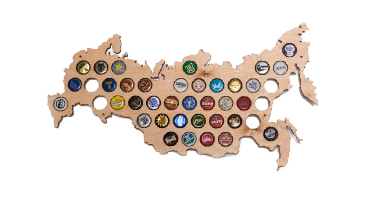 Este accesorio para el hogar es una alcancía plana con forma de mapa de Rusia, gracias a la cual podrás explorar el “mapa del mundo cervecero de tu país”. El producto está hecho de madera. El primero tiene 41 agujeros para tapas de cerveza. Debido a las peculiaridades de la forma, no puede colocarse sobre una superficie plana y, por lo tanto, solo se fija a la pared con clavos. También se incluyen imanes, gracias a los cuales la alcancía se puede colgar en el refrigerador.