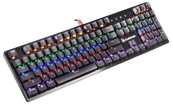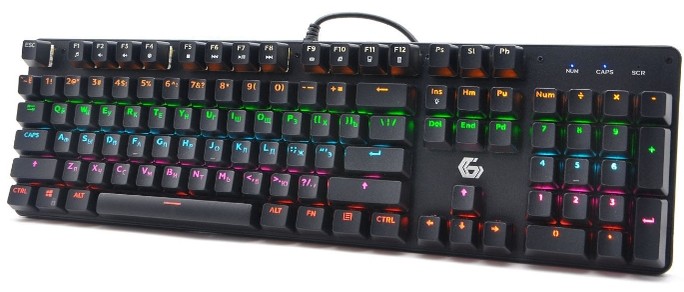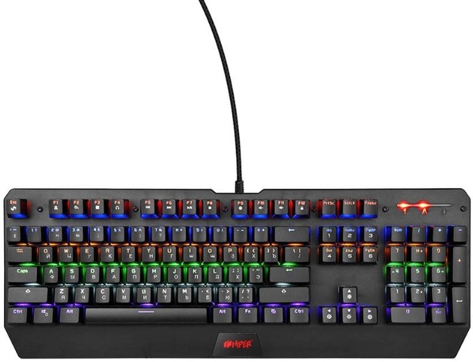 Este teclado mecánico de 104 teclas se complementa a la perfección con una retroiluminación multicolor con 9 modos de funcionamiento. Además, tiene un módulo NumPad y teclas de función. El modelo está conectado a una PC mediante un cable, cuya longitud es de 1,5 metros. El estuche confiable hecho de metal tiene un peso de 795 G. Es resistente al estrés mecánico (caídas, golpes), por lo que este dispositivo es adecuado incluso para jugadores expresivos.
