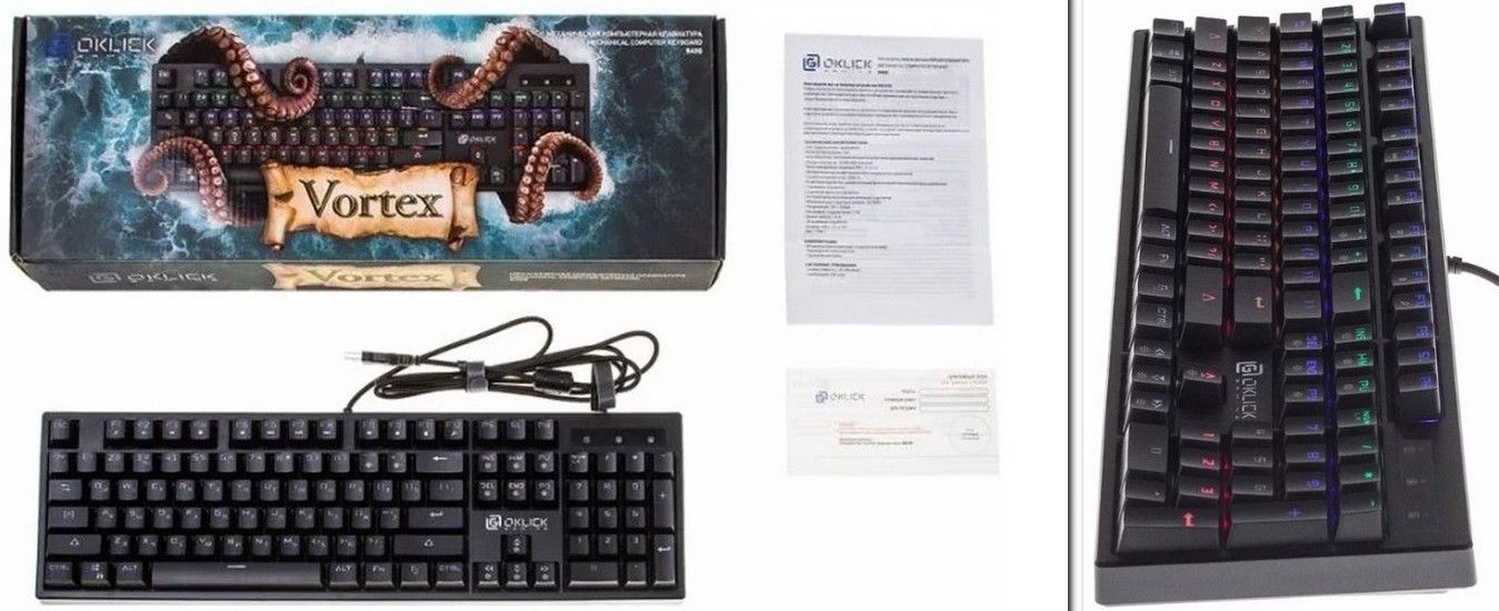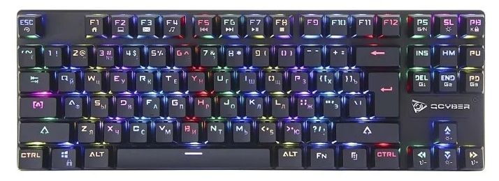 Teclado de plástico negro. Propósito - para una computadora personal. Se conecta por cable. El teclado está equipado con una variedad de modos de color y un teclado numérico. Es de tamaño compacto, pero de tamaño completo. El diseño es ruso e inglés.