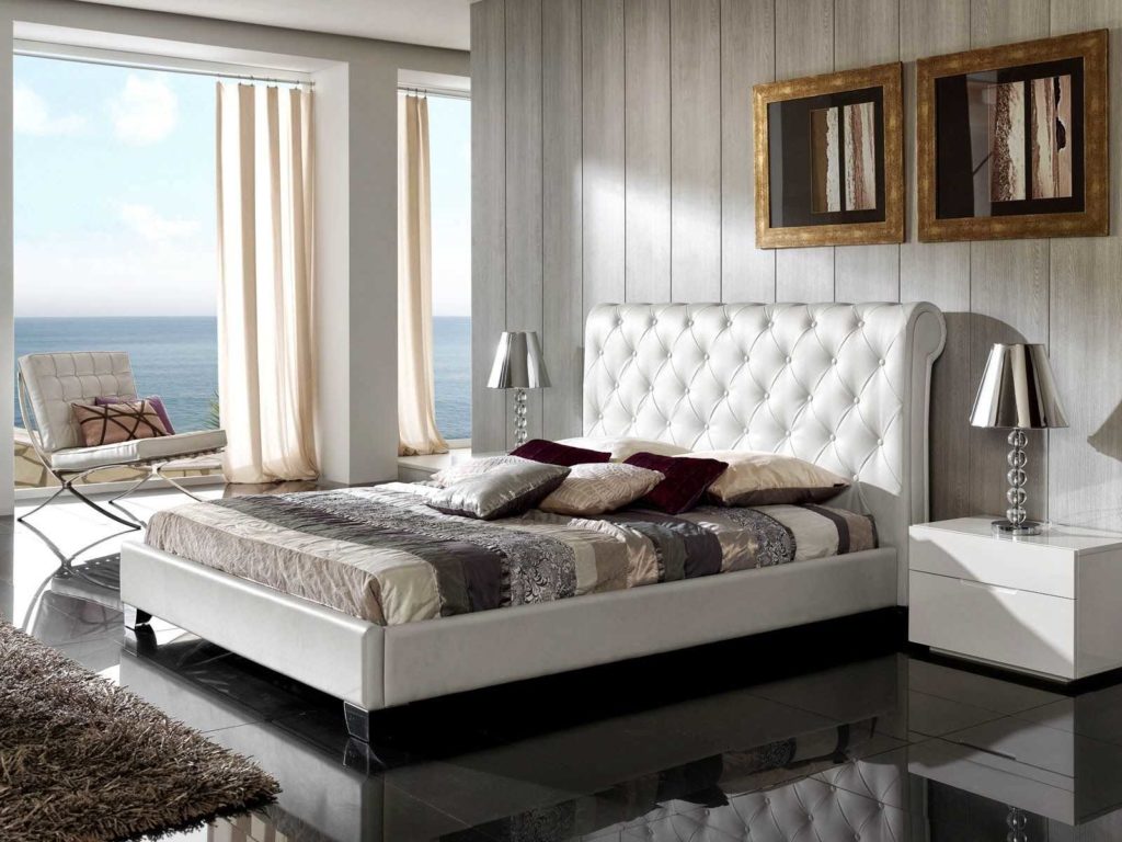 Los aglomerados, MDF y tableros de fibra generalmente se venden en forma laminada. Por lo tanto, la apariencia de los productos hechos con ellos es muy hermosa. El dibujo laminado puede copiar una especie de piedra o madera. A menudo, los fabricantes cubren sus productos con chapa, se ajustan con cuero ecológico y otros materiales. Tales cosas se ven ricas en el dormitorio. Al comprar dichos productos, debe prestar atención al cuero ecológico o tela de alta calidad.