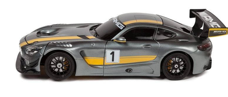 Rastar Mercedes AMG GT3 es un automóvil deportivo con ruedas potentes que le permiten superar incluso obstáculos difíciles y realizar maniobras simples. El panel de control es conveniente y fácil de usar, con la ayuda de él, el automóvil puede moverse en todas las direcciones y en el cuerpo mismo hay señales de luz que atraen la atención de los usuarios jóvenes.