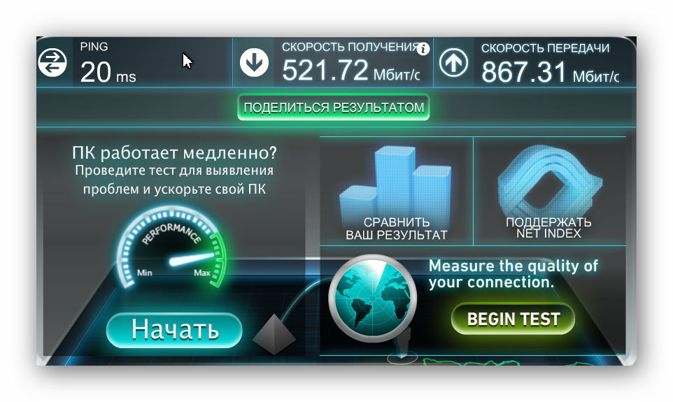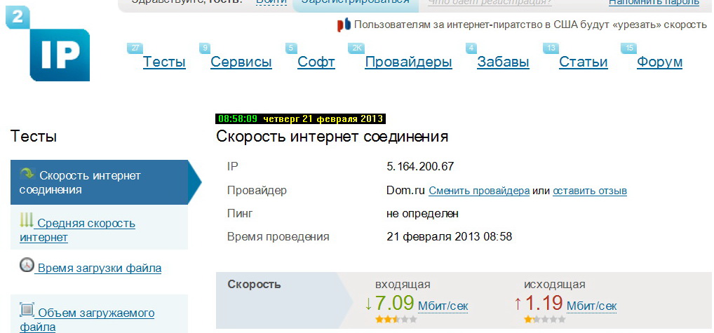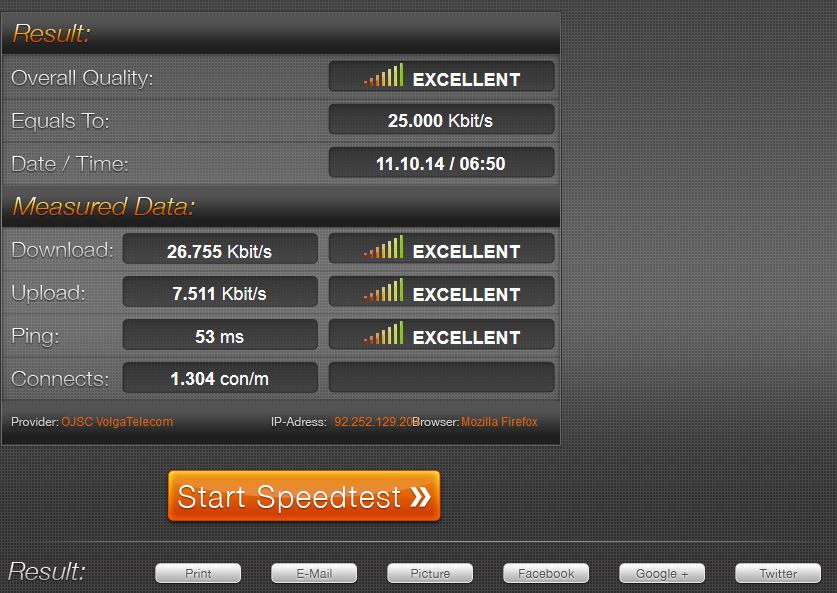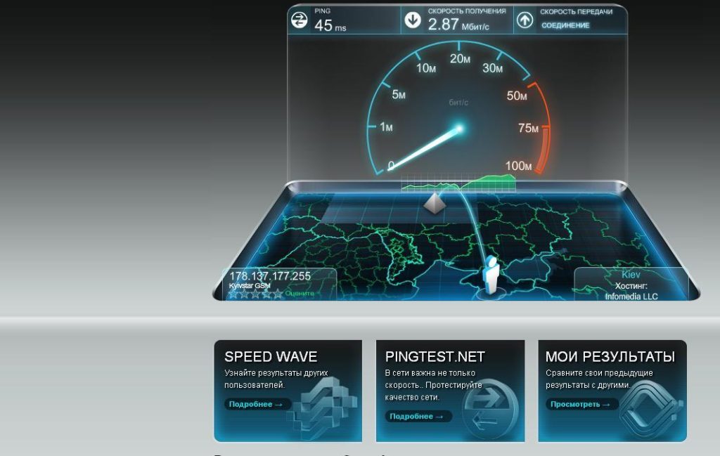 De los desarrolladores nacionales. Lanzado después de presionar el botón "Test". Para obtener datos confiables, el servicio recomienda deshabilitar los programas que usan la conexión a Internet y repetir la verificación varias veces.