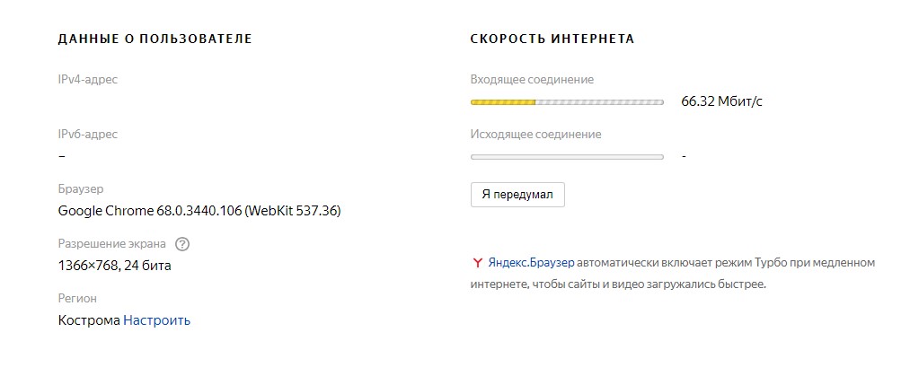 Servicio de Yandex con funcionalidad mínima. Después de verificar, el usuario recibe los resultados de la conexión entrante y saliente, así como información técnica detallada sobre el navegador.