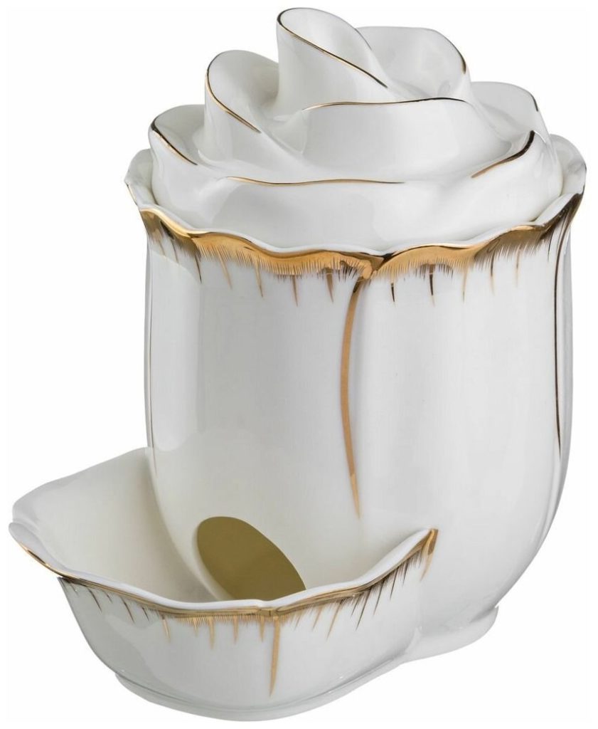 La forma inusual le permite decorar cualquier mesa con un recipiente. El producto en forma de bulbo de ajo impresionará a todos los miembros de la familia. El producto es cómodo de llevar en las manos, ya que la forma ondulada no se desliza. La porcelana no absorbe el exceso de olores y no emite sustancias nocivas. Además, la ventaja de este material es su fácil mantenimiento.