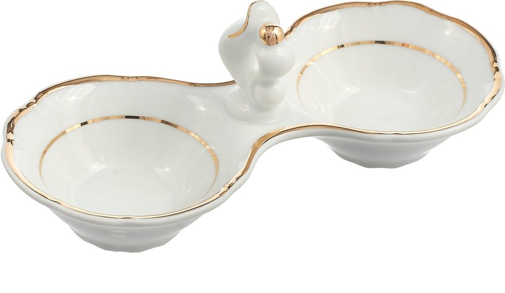 Un salero doble es la solución perfecta para un gran festín. A pesar de que el producto está abierto, esto no reduce la popularidad del modelo. Dos pequeños tazones de especias están conectados entre sí y son adecuados para los amantes del estilo clásico.