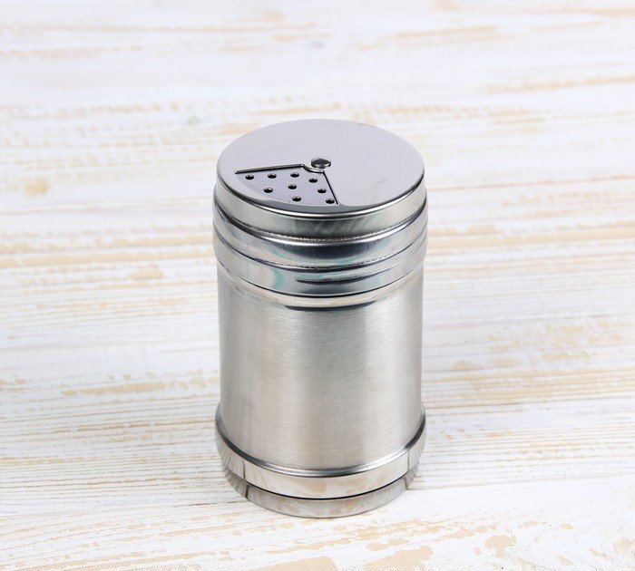 El producto está hecho de metal delgado, por lo que incluso si se cae, no se daña. La altura del producto es de 8 cm, por lo que el artículo no ocupa mucho espacio. La tapa se cierra herméticamente, las aberturas especiales para sal se pueden cerrar con una válvula especial. Esto evita que las especias se mojen y se aglomeren.