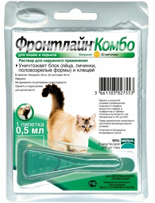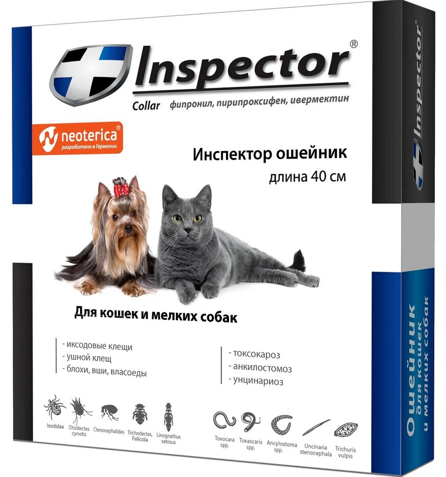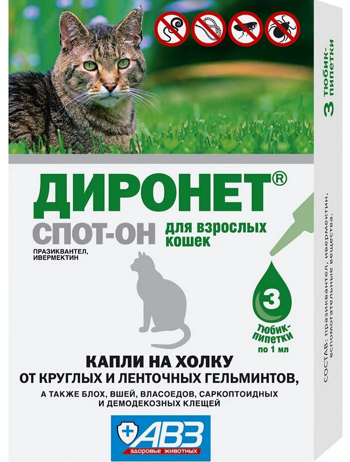 Se prescribe para gatos para proteger contra pulgas, piojos, garrapatas, cruz, helmintos.