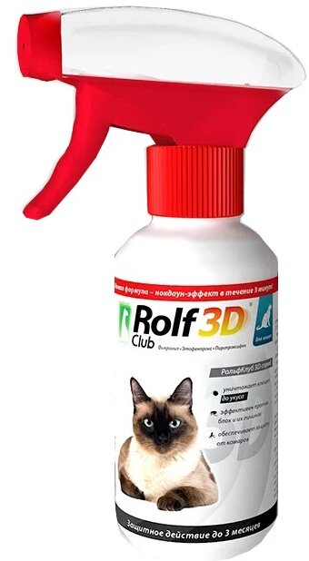 La botella de plástico blanca tiene una etiqueta con información, una foto de un gato. Se cierra con un atomizador blanco-rojo. Capacidad - 200 ml.