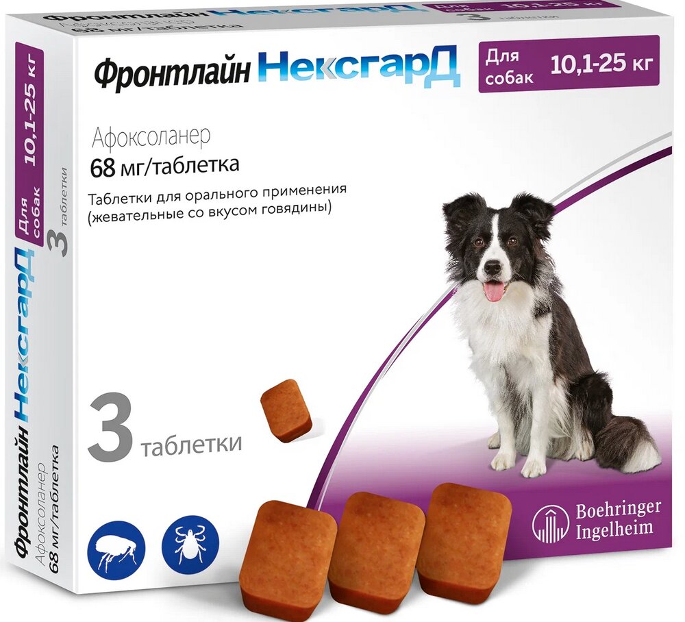 Una tableta - 68 mg. Absorbido en la sangre, la concentración máxima - después de 2-4 horas. La muerte de insectos - 6 horas (pulgas), 2 días (garrapatas). Duración de la protección - 28 días.