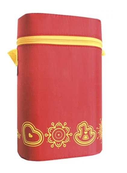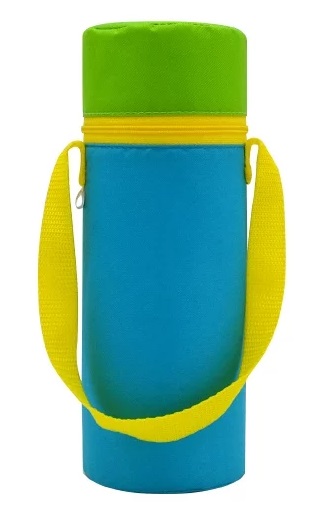 Dicho recipiente térmico puede acomodar dos botellas con un volumen de 350-450 ml. Para la producción de este modelo se utilizan telas y espumas resistentes al desgaste. Para facilitar el transporte, hay un asa de tela que no se desliza en la mano. El calor se puede mantener durante varias horas. Gracias a esto, será posible aumentar el tiempo de la caminata, ir de viaje o visitar la clínica.