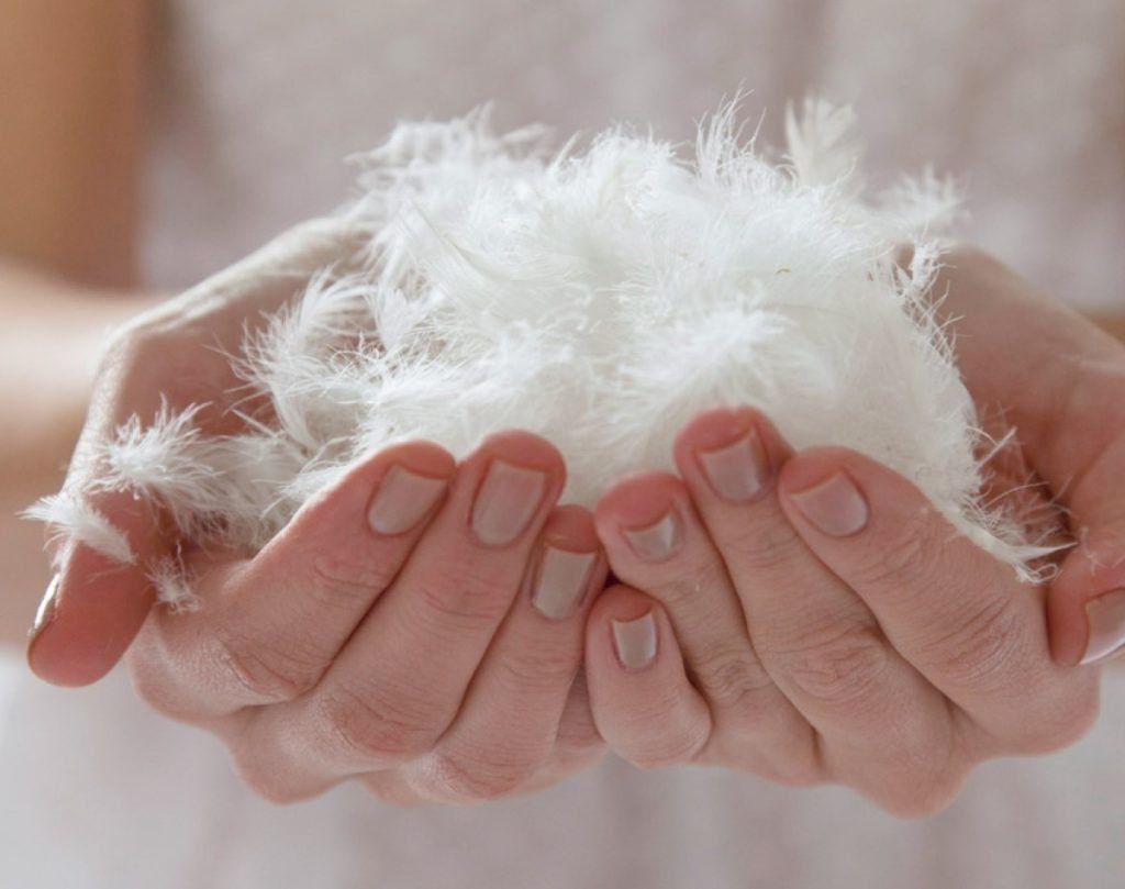 Este es el componente más aceptable y conocido con relleno natural. Se usa solo cuando no tiene ninguna reacción alérgica. Vale la pena señalar que esta es una de las opciones más caras, pero el precio final depende del tamaño y la cantidad de plumón y pluma.