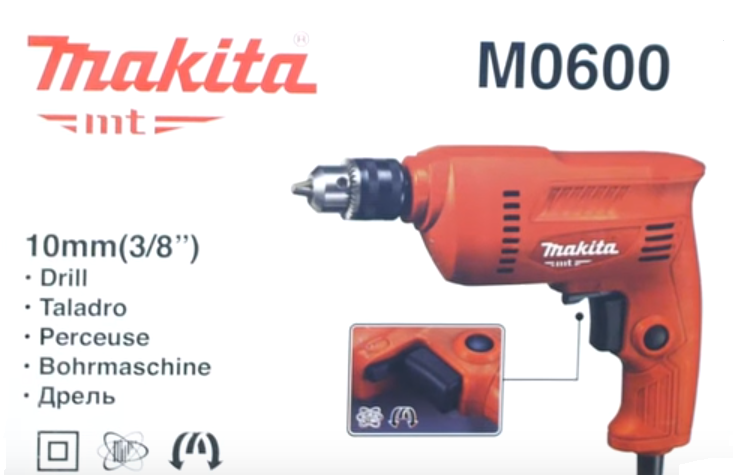 | Makita M0600 | Koskematon, istukka - avain, teho 350 W, maksimi kierrosluku - 3000, langan pituus 2 m, poraushalkaisija puulle - 20 mm, metallille - 10 mm, paino - 1,2 kg, ominaisuudet: peruutus, nopeudensäädöllä. | 2300 ruplaa |