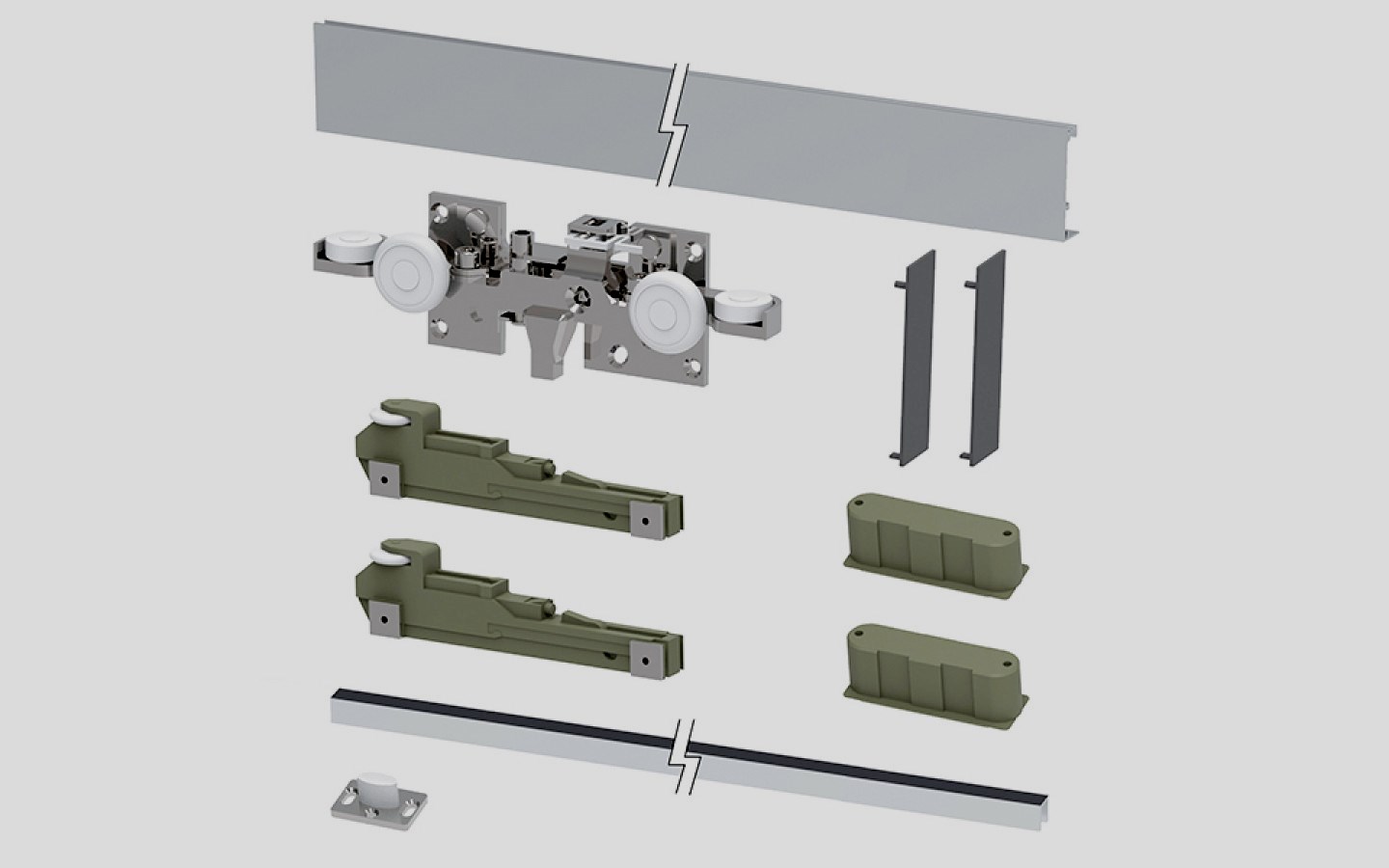 Sustav je namijenjen za ugradnju drvenih kliznih vrata težine do 80 kg i širine do 1 metar. Gotovo svi elementi skriveni su u samom platnu. Savršen za sofisticirani dizajn. Nije potrebno dodatno glodanje i priprema krila vrata. Prilikom ugradnje kompleta dobiva se slobodan otvor širine 96 cm Komplet je opremljen zatvaračima s obje strane, valjcima, donjim zatvaračem i vodilicama.