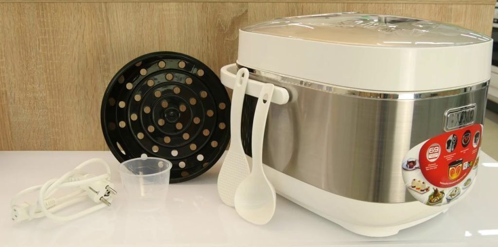 A multicooker-rizsfőző élénk fehér és bordó színben készül. A ház anyaga – műanyag, de minden megbízhatóan és hatékonyan van összeszerelve. Méretei 27*32*41 cm, súlya 3,7 kg.