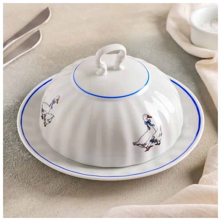 A képen látható edények üvegből készültek, üvegfedelesek, külső oldalán kék szalaggal a nyakukban házilibák láthatók. A fajra utal - láb nélkül. Mérete 8 cm átmérőjű és 7 cm magas. A modell hagyományos fehér színben készül.