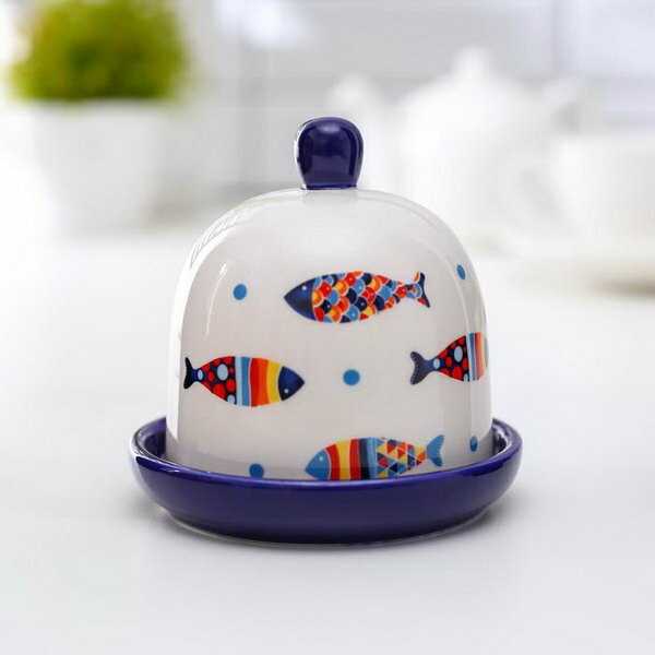 Az "Emelya" egy szabványos citromkészítő láb nélkül, de a fedél végén fogantyúval. Dolomitból készült - egyfajta kerámia, amelyet súlytalanság és fényes kialakítás jellemez. A termék fedelén a többszínű halak minimalista stílusban vannak ábrázolva, maga a csészealj pedig mélykékre van festve. Mérete a következő: 9x9x9 cm.
