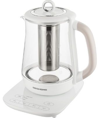 Kényelmes elektromos teáskanna szűrővel az állványon, érintésvezérléssel és kijelzővel.Működés közben a tartály 360 fokkal elforgatható bármely irányba. Az állványon található érintőpanel segítségével kiválaszthatja a négy vízmelegítési hőmérsékleti beállítás bármelyikét a különféle teafajták megfelelő főzéséhez. A beállított hőmérsékletet két órán keresztül fenntartjuk, hogy a tealevél teljesen kinyíljon. Az állványról levéve nincs víz vagy forrás, a modell automatikusan kikapcsol. Megbízható érintkezőcsoport rejtett lemezfűtéssel akár 12 000 be- és kikapcsolási ciklust biztosít. Az egyedi loft stílusú termék klasszikus fehér színben hőálló üvegből készül.