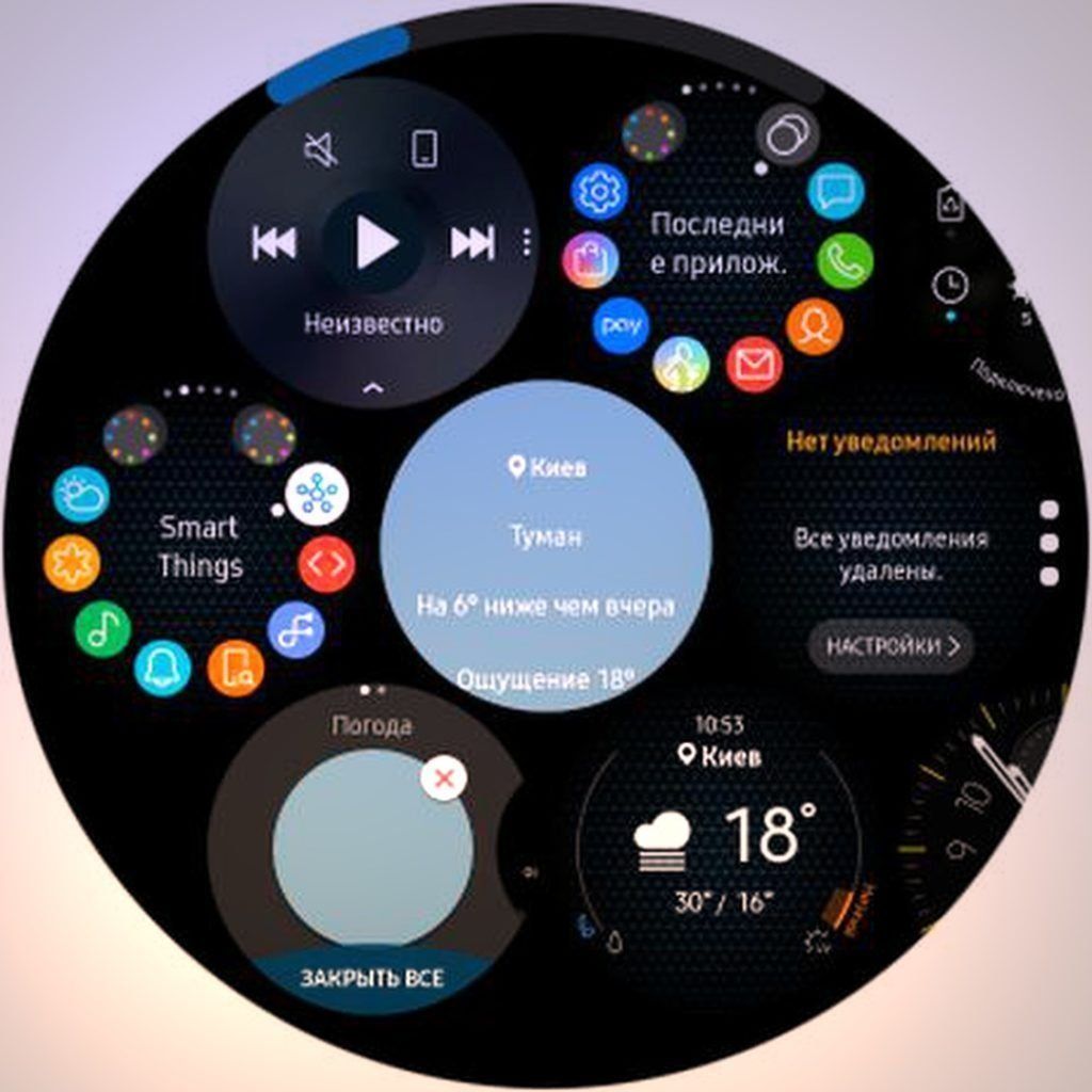 Antarmuka sistem operasinya sendiri bisa dibilang sama dengan versi sebelumnya. Tampilan utama di dalamnya selalu berupa dial yang menunjukkan waktu dan informasi berguna lainnya.Jika Anda menggesek ke kanan, tampilan notifikasi akan terbuka, dan ke kiri - widget yang dapat Anda hapus dan ubah ke yang lain.