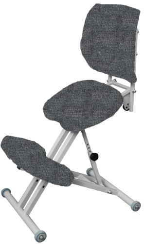 Kursi ortopedi lutut, yang tubuhnya terbuat dari baja, memiliki desain yang tidak mencolok yang memungkinkan furnitur digunakan di interior apa pun, termasuk di kantor. Kursi empuk dan bantalan lutut memiliki pengisi busa poliuretan yang dilapisi dengan anyaman di atasnya.