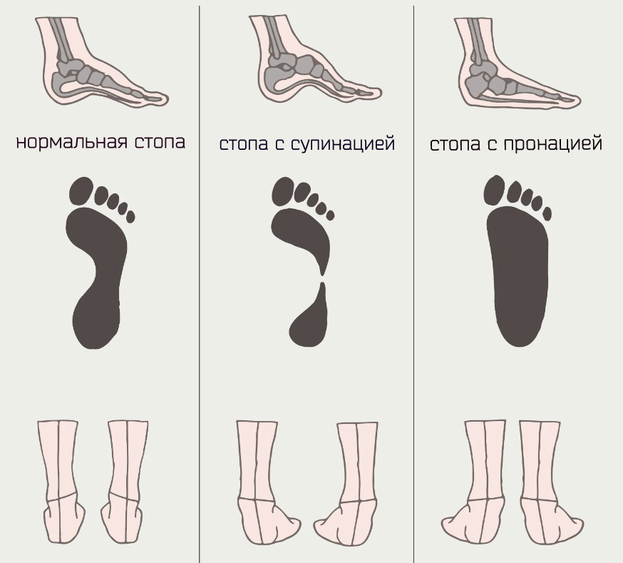 Ada pronasi netral (benar), berlebihan dan tidak mencukupi. Overpronasi lebih dikenal sebagai "kaki datar", di mana seseorang menginjak bagian dalam kaki lebih dari yang diperlukan. Dalam hal ini, sepatu harus dengan penyangga lengkung. Dengan pronasi berlebihan (supinasi), kebalikannya benar - sisi luar lebih terlibat. Oleh karena itu, tidak boleh ada penyangga lengkung, dan sisi luar harus lebih kuat.