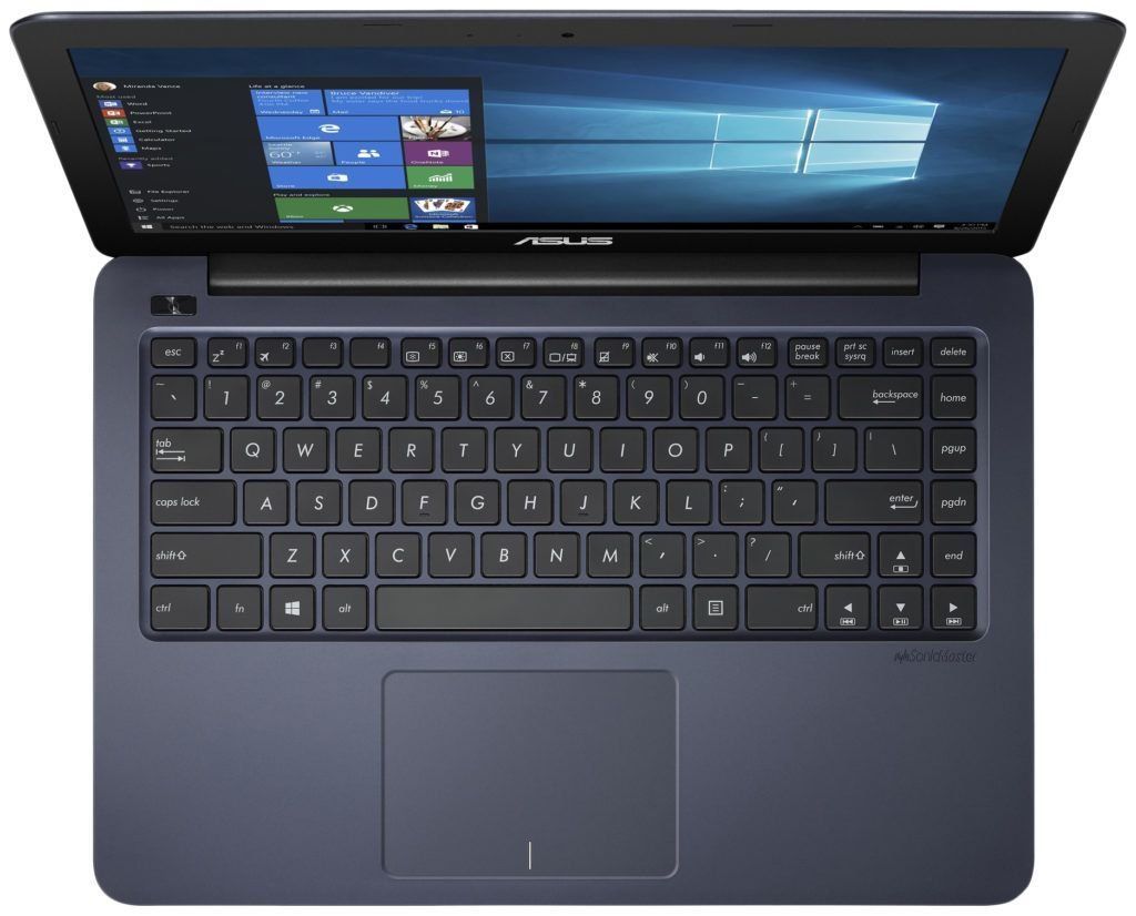 Berfokus pada harga yang murah, Anda tanpa sadar memperhatikan model ASUS E402WA yang ringan dan ringkas. Berat perangkat hanya 1,65 kg, desainnya klasik, ada beberapa variasi konfigurasi. Kasing di "perangkat keras" ini adalah plastik, Anda dapat memilih warna: biru atau hitam. Ada sepasang speaker di kasing, dan keyboard dilengkapi dengan touchpad klasik.
