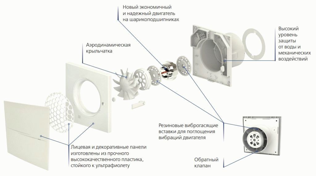 Ini adalah model tengah dari seri kipas knalpot kamar mandi yang populer.Tidak ada sensor kelembaban di sini, perangkat dihidupkan secara manual, tetapi harganya cukup terjangkau untuk kualitas seperti itu. Jika tidak, semuanya seperti model teratas: daya 8 watt, produktivitas 95 meter kubik udara per jam, wadah kedap air, dan tingkat kebisingan rendah. Motor listrik fase tunggal pada bantalan bola terpasang ke rumah dengan blok diam karet yang mencegah transfer getaran ke rumah kipas.