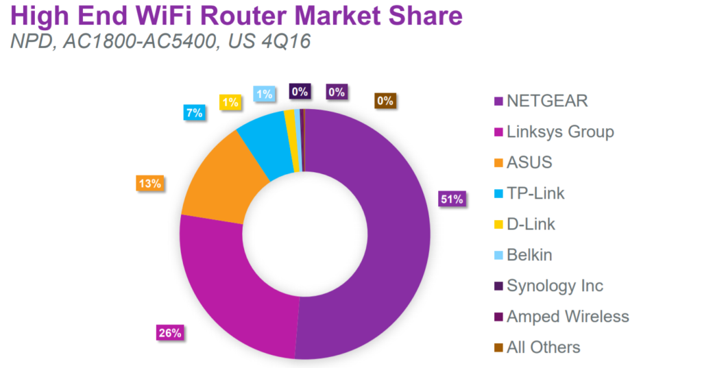 Penjualan yang sangat kecil dari Synology Inc dan Amped Wireless (0%), pada saat yang sama, hampir setengah dari segmen pasar ditempati oleh Netgear. Dan ini memang layak: ini memberikan kontribusi yang signifikan terhadap pengembangan teknologi Internet nirkabel.
