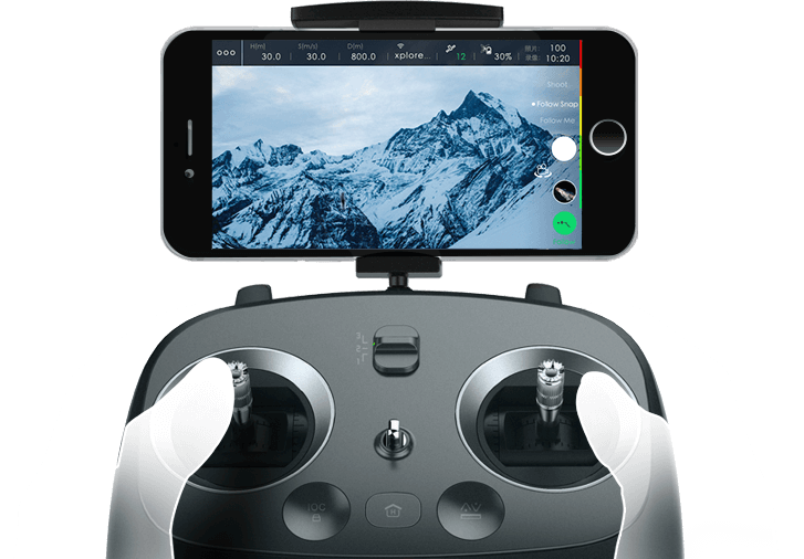 Saat mengendalikan quadcopter, sangat nyaman menggunakan smartphone. Anda perlu menginstal aplikasi XIRO XPLORE di atasnya, dan Anda dapat langsung melihat area sekitarnya melalui mata drone. Siaran dilakukan melalui Wi-Fi dalam kualitas HD 720. Ada sedikit nuansa di sini. Sayangnya, dudukan telepon dirancang untuk perangkat kecil. Jika smartphone memiliki diagonal layar lebih dari 5,5", maka mungkin tidak muat di dudukannya.