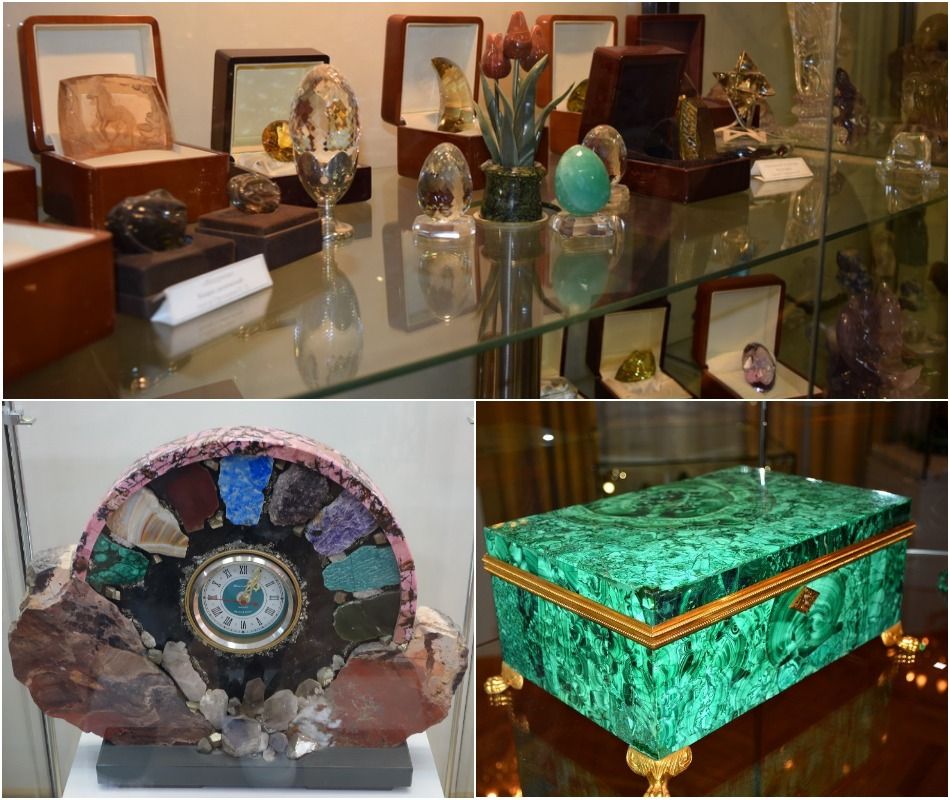 Pameran museum digabungkan menjadi beberapa pameran tematik, yang terletak di tiga lantai gedung. Di lantai pertama ada Aula Bazhov, yang menyajikan panel Palekhansk yang mencerminkan plot dongeng Bazhov. Di lantai dua terdapat Emerald Room dan Malachite Hall, yang memamerkan contoh paling menonjol dari seni pemotongan batu dari masing-masing batu. Lantai ketiga ditempati oleh pameran seni pahat batu abad 18-20, yang menampilkan pameran dari Pabrik Lapidary Kekaisaran Yekaterinburg.
