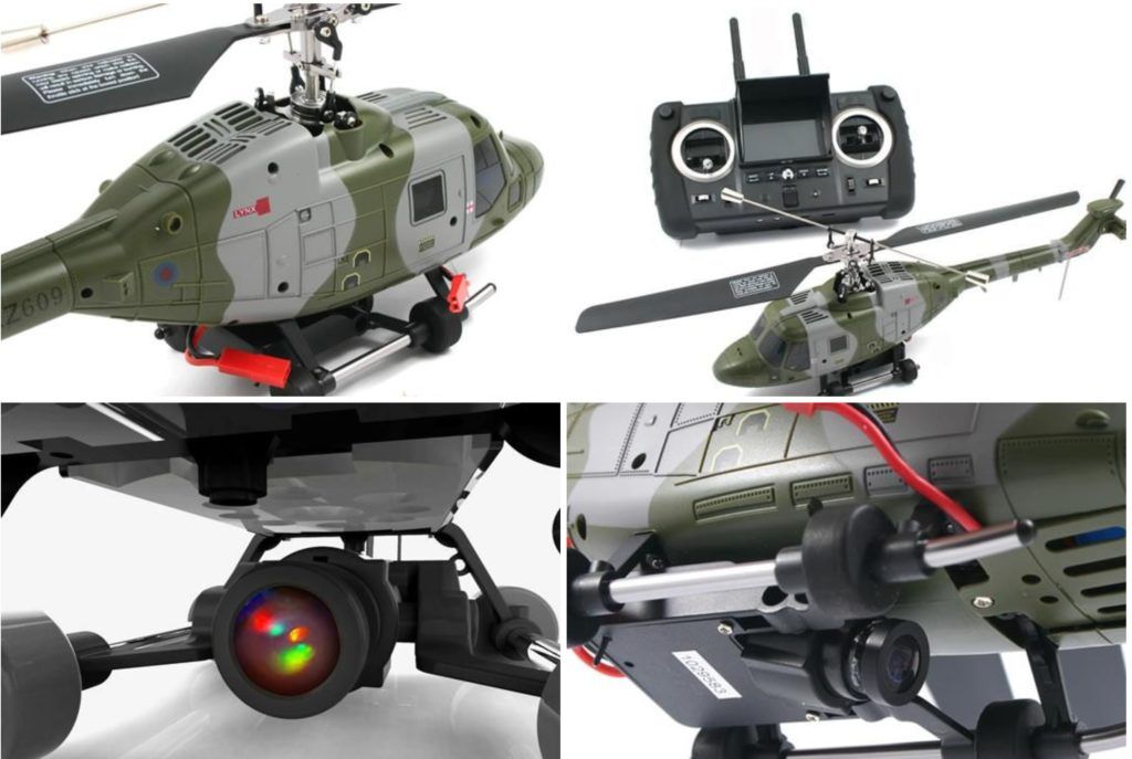 Sasis, ekor - terbuat dari logam, badan - plastik, sistem koaksial. Mesinnya kolektor, ada giroskop. Konsol tiga saluran. kontrol inframerah. Lebih andal, berkat bilah tambahan.