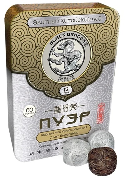 Pressed Black Dragon yang berumur 7 tahun memiliki rasa dan bau yang tidak biasa. Ini memiliki efek tonik yang kuat, merangsang metabolisme dan memiliki efek positif pada aktivitas otak.