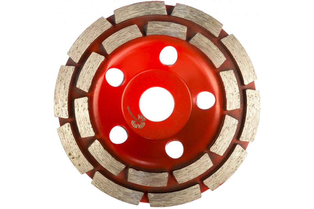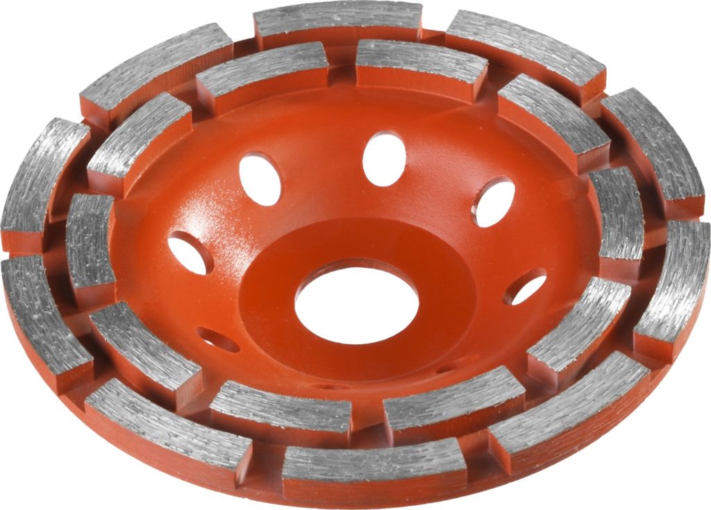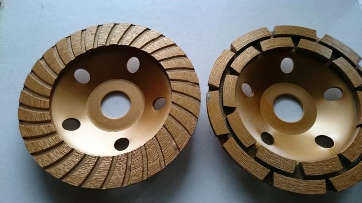 Desain dua baris nyaman untuk menggiling batu pasir dengan batu. Banyak pembangun menggunakannya untuk menghilangkan screed berlebih. Namun, dengan cangkir ini tidak mungkin untuk melakukan penggilingan halus. Permukaan menjadi kasar. Itu bisa ditutup dengan bahan lain atau selesai.Tetapi ini akan membutuhkan nosel yang berbeda dengan karakteristik yang berbeda.