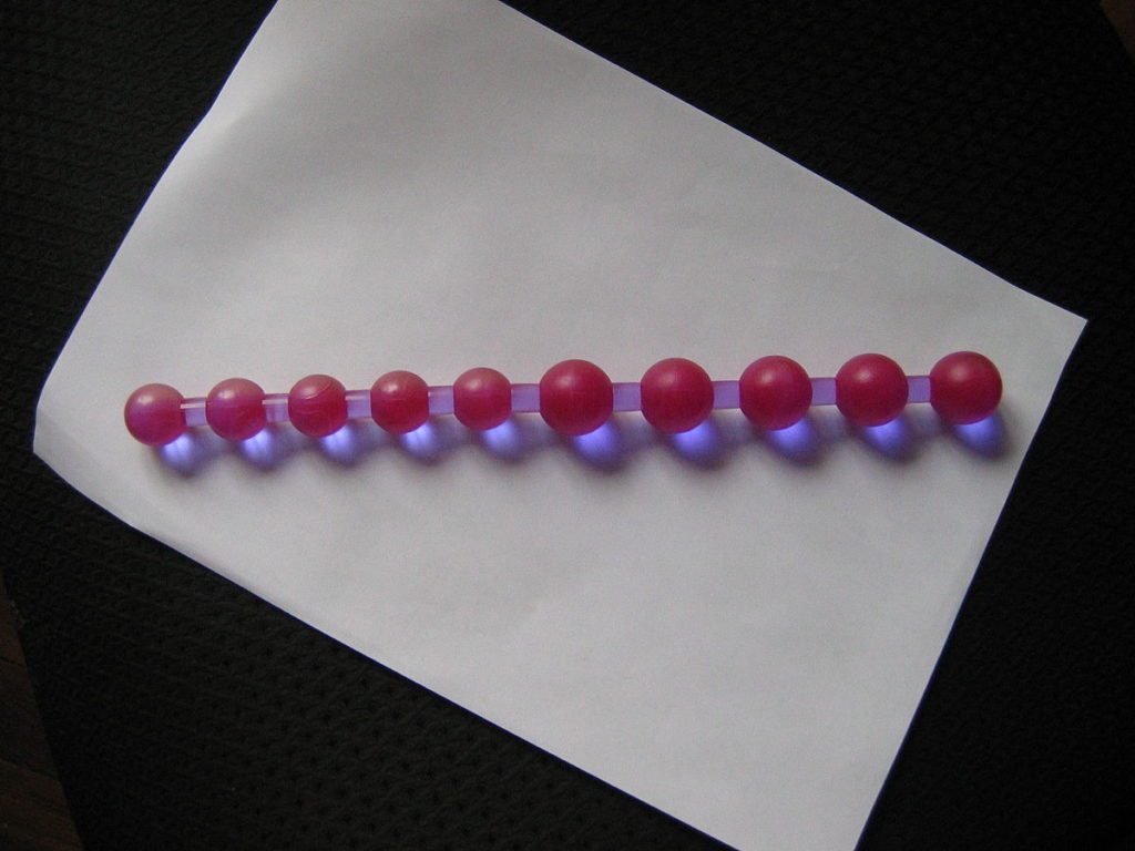 Manik-manik memiliki diameter yang berbeda. Mainan dilengkapi dengan cincin yang memberikan kenyamanan dan keamanan saat digunakan. Cincin tersebut memiliki hiasan asli berupa kupu-kupu. Manik-manik terbuat dari silikon berkualitas tinggi, karena itu mereka memiliki sifat seperti fleksibilitas, sementara bahannya tidak berpori. Panjang kerja adalah 12 cm.