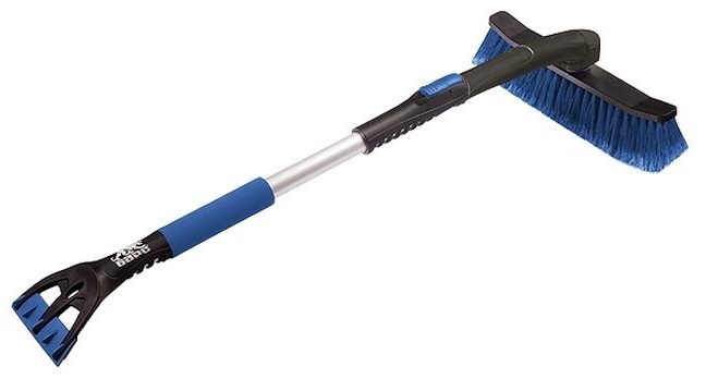 Pengikis menghilangkan kerak es dari jendela dengan cepat dan akurat, dan sikat, yang terbuat dari bulu halus, tidak merusak cat saat menyapu salju dari permukaan mobil. Para ahli mencatat kualitas bagus dengan harga terjangkau. Model ini mewakili desain monolitik dan berbeda dalam keandalan dan daya tahan. Pegangan inventaris pendek, dan bulu sikatnya terlalu lembut, yang oleh pengguna dianggap sebagai kerugian.