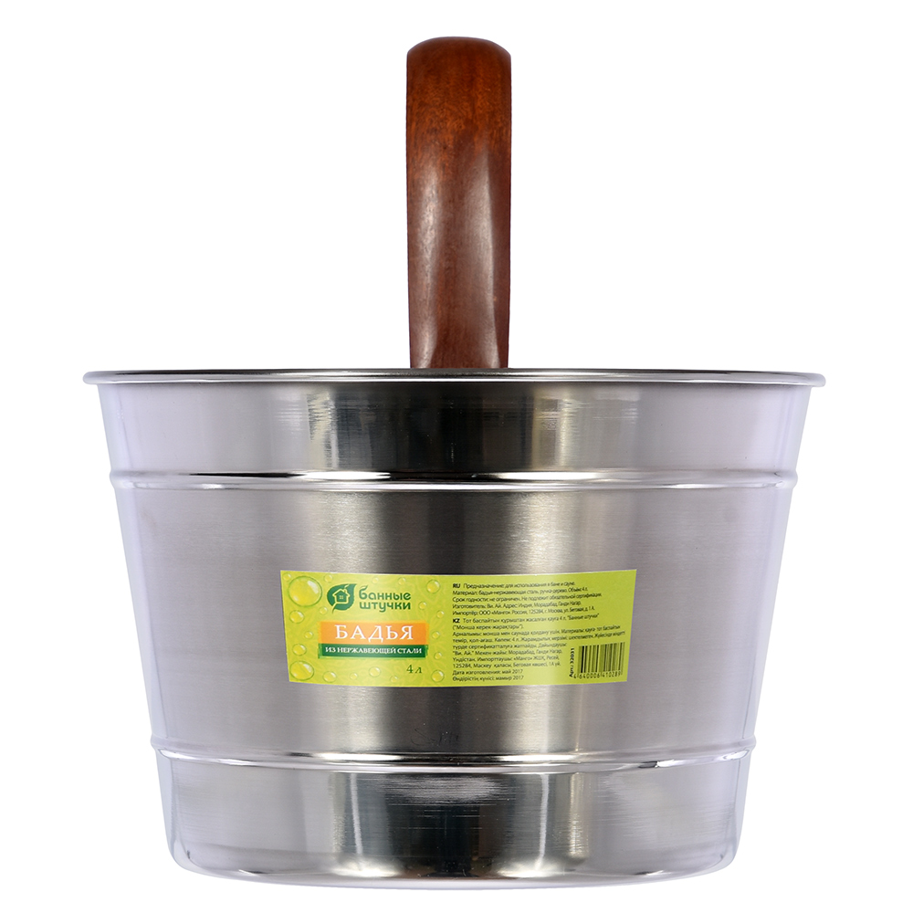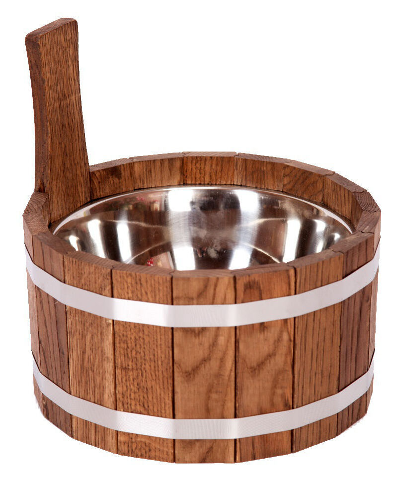 Wadah 4 liter untuk mandi dan sauna, yang disajikan oleh pabrikan Rusia, terbuat dari larch pilihan. Kayunya memiliki ciri-ciri tertentu yang membedakannya dari pohon lain.Ini termasuk ketahanan terhadap pembusukan dan konduktivitas termal yang sangat rendah. Karena kualitas ini, pegangan, serta seluruh tubuh, tidak memanas, bahkan jika ada air mendidih di dalam wadah. Detail konstruksi dihubungkan dan diikat bersama oleh dua lingkaran logam. Pengencang ini tidak menggunakan lem, karena metode penyambungan yang digunakan adalah kerja sama. Metode ini menjamin keandalan, daya tahan, dan masa pakai produk yang lama. Pegangan memanjang adalah kelanjutan dari salah satu paku keling di dasar atribut, yang menciptakan kenyamanan dalam penggunaannya dan memastikan kekuatan struktur itu sendiri.