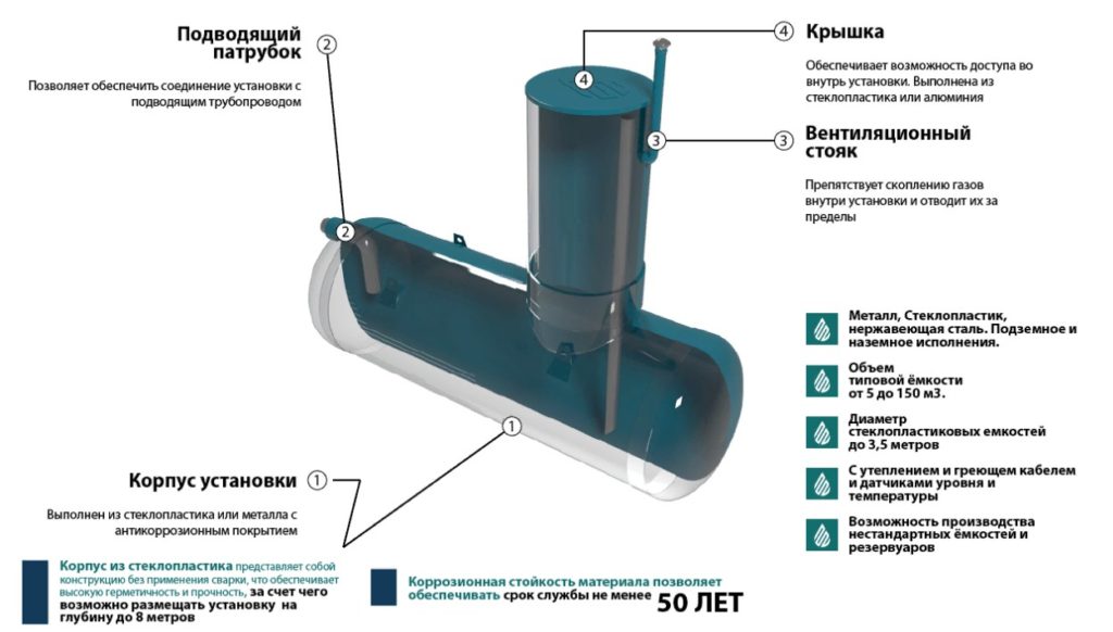 Tangki terbuat dari polietilen makanan murni, yang cocok untuk interaksi dengan produk dan zat makanan. Tangki adalah struktur berukuran besar dengan kekencangan yang sangat baik.Untuk penyimpanan bawah tanah, perusahaan memproduksi struktur horizontal, dan untuk pemasangan di atas tanah, rangkaian produk mencakup produk vertikal dan horizontal, yang diperkuat dengan penyangga, kaki, dan pondok.