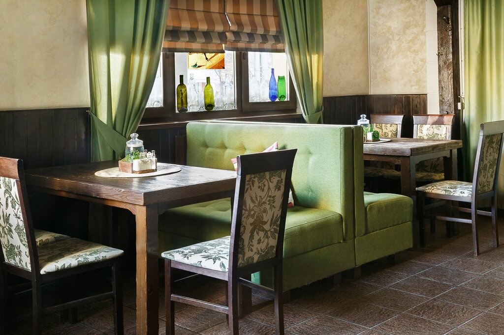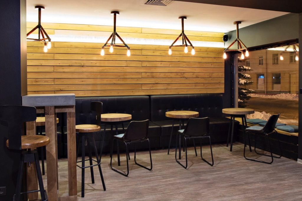 Cafe-bar, di mana Anda bisa pergi di malam hari untuk menikmati makanan lezat dan minum segelas anggur. Interior dibuat dalam warna hangat dan terkendali. Balok langit-langit dekoratif, meja kayu dikombinasikan dengan bar kompak dan kap lampu kain. Lorong di antara meja lebar, sehingga para tamu dapat dengan aman bergerak di sekitar aula tanpa menimbulkan ketidaknyamanan bagi pengunjung lain.