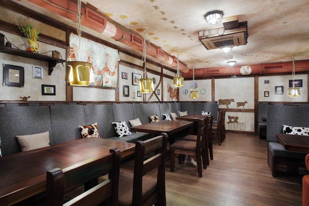 Interiornya merupakan kombinasi gaya pedesaan dan ramah lingkungan. Gambar lucu sapi di dinding, dan jejak kuku di langit-langit. Tudungnya dirancang dalam bentuk roti sosis besar yang diikat dengan benang. Lampu tanah liat dan banyak tekstil. Secara umum, sangat nyaman.