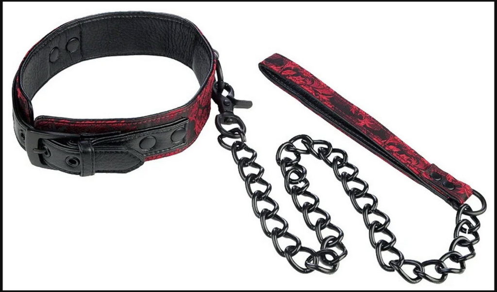Atribut desainer aksesori erotis dari koleksi VIP sensual Scandal pasti akan menyenangkan penggemar hiburan BDSM. Kerah dilengkapi dengan tali rantai logam dengan lingkaran sikat khusus, yang dipangkas dengan gaya dengan kain yang dihias dengan pola desainer dalam benang merah mengkilap. Tali diikat dengan carabiner ke kerah, borgol atau penyangga kaki sesuai keinginan.