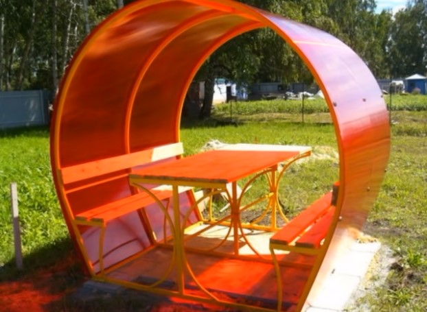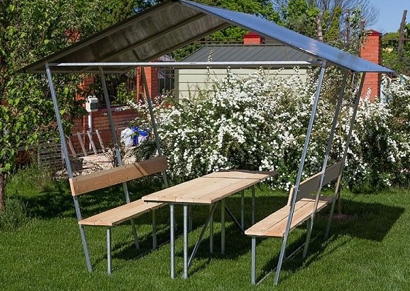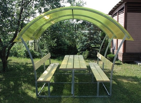 Pilihan yang sangat baik untuk gazebo tipe terbuka yang murah untuk liburan musim panas yang terbuat dari profil galvanis dan atap pelana yang terbuat dari polikarbonat seluler. Cocok untuk area kecil karena dimensinya yang ringkas. Meskipun murah, ini adalah produk berkualitas: profil dilindungi dari korosi, meja dan bangku papan yang direncanakan diperlakukan dengan komposisi antibakteri. Anda dapat memilih warna polikarbonat untuk atap dari palet apa pun yang ditawarkan oleh produsen. Strukturnya tidak akan menyelamatkan Anda dari angin kencang dan hujan, tetapi akan melindungi Anda dari hujan dan hujan es di musim panas. Jika diinginkan, Anda dapat dengan cepat membongkar atau pindah ke tempat lain di situs.
