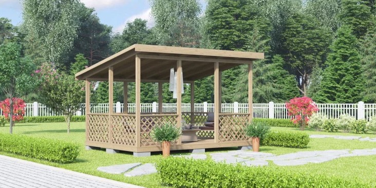 Model terbuka yang nyaman dengan atap kanopi yang terbuat dari ondulin merah, coklat atau hijau dipasang di atas fondasi balok. Lantai terbuat dari papan beralur atau papan dek untuk dipilih, tiang utama dan sudut rangka penyangga terbuat dari kayu kayu lunak, yang telah menjalani perawatan antiseptik. Tidak ada lapisan dinding, bukaan diisi dengan kisi pergola. Satu pintu masuk, tidak ada pintu. Bebas menampung 8 orang. Anda dapat memasang barbekyu atau barbekyu. Pabrikan memberikan garansi operasional hingga 15 tahun.