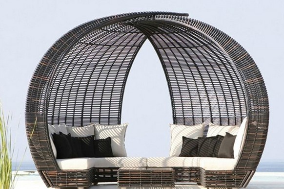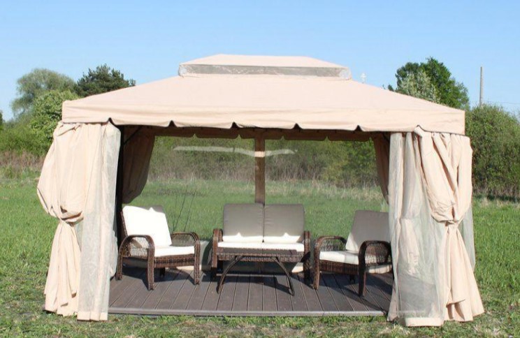 Selain kelambu, gorden tahan angin terletak di sekeliling seluruh perimeter, yang secara andal akan melindungi dari angin kencang di musim dingin, dengan cepat mengubah rumah dari terbuka menjadi tertutup. Kombinasi warna yang menyenangkan dari rotan buatan rosewood dan tekstil krem akan memungkinkan bangunan untuk secara harmonis masuk ke dalam desain situs apa pun. Untuk estetika yang lebih besar, Anda dapat memilih ayunan, kursi geladak, tempat tidur gantung yang sesuai.Untuk bantal sofa dan kursi, kain tahan air tahan api digunakan. Jika perlu, dimungkinkan untuk memagari debu, angin, serangga, sinar matahari yang cerah. Lantai decking yang tahan lama akan bertahan hingga 50 tahun. Tenda tahan air di atap dilengkapi dengan superstruktur berventilasi untuk mengurangi angin.