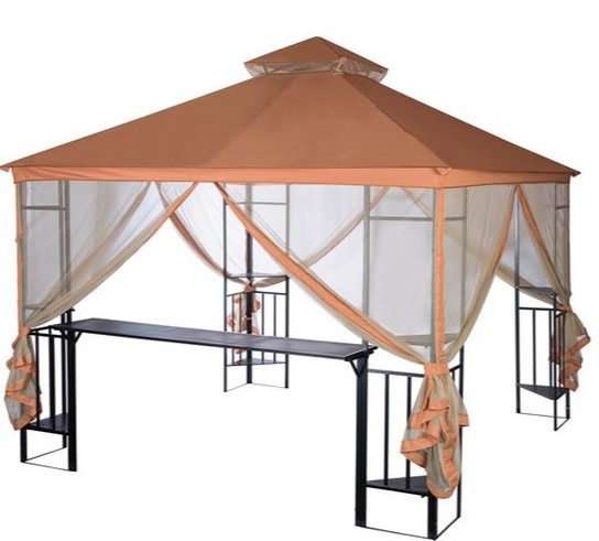 Model praktis yang andal dengan kelambu dengan ritsleting di sekelilingnya akan menyelamatkan Anda dari panas, serangga, dan hujan. Berkat bentuknya yang persegi yang elegan, atap berpinggul, tenda dengan superstruktur ventilasi, penyangga logam ringan, itu akan menghiasi area pinggiran kota mana pun. Ada meja bar built-in, meja segitiga sudut. Sempurna untuk prasmanan.