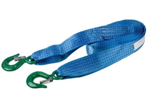Kabel pita dengan dua kait logam selebar 5 sentimeter tahan terhadap kelembaban dan suhu rendah. Kait memiliki kelas daya tahan ke-8. Kait menahan beban dengan aman dan mencegahnya tergelincir. Cat biru cerah membuat pita itu menonjol di jalan abu-abu. Model ini memungkinkan Anda untuk mengambil mobil derek dengan massa hingga 5 ton.