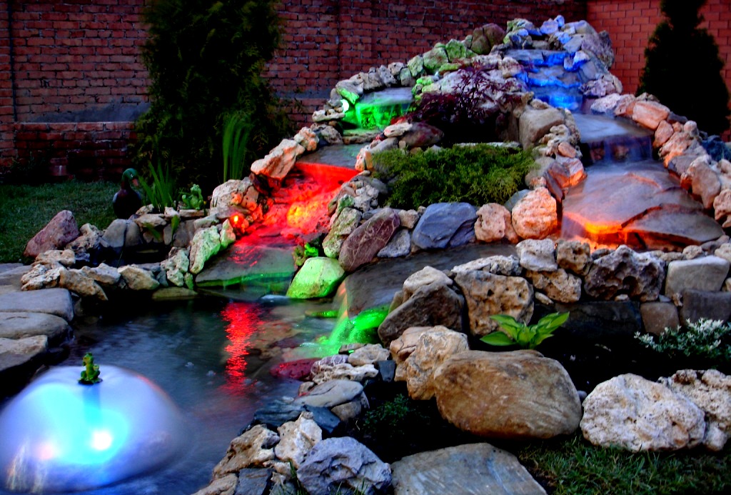 Penerangan memainkan peran penting. Ini memberikan pesona desain, terutama di malam hari. Biasanya, bola lampu dipasang di air. Ada tampilan statis dan dinamis multi-warna. Bagi pecinta yang luar biasa, Anda dapat memilih produk dengan efek khusus, misalnya dengan musik berwarna.