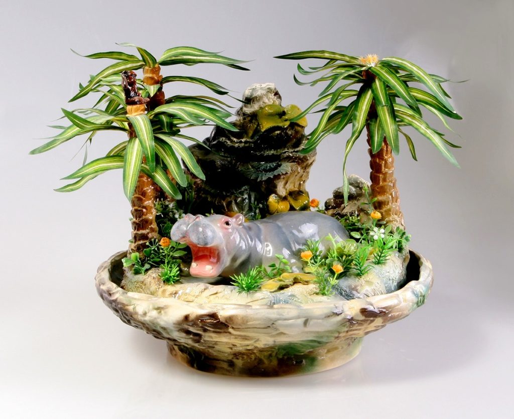 Air mancur kompak rumah lebih lucu daripada serius. Pameran ini mencakup tiga pohon palem dan kuda nil dengan latar belakang batu. Dimensi: 36*42*42 cm, berat - 9 kg. Pabrikan memproduksi barang dari porselen mulia yang ramah lingkungan. Keamanannya dijamin oleh sertifikat kualitas. Hadiah orisinal untuk generasi muda, pecinta alam, penikmat keindahan.