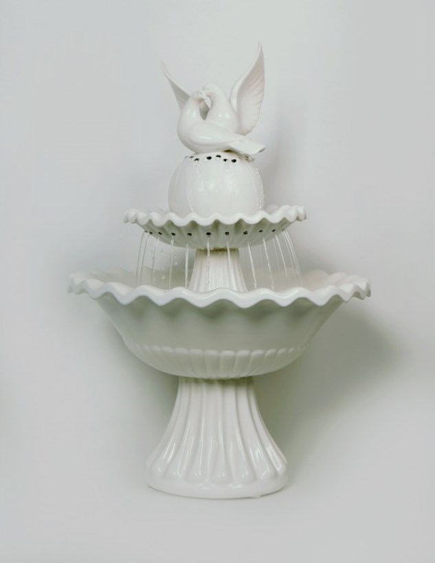 Meskipun tingginya signifikan (65 cm), merupakan kebiasaan untuk memasang struktur di atas meja. Air mancur ditutupi dengan glasir putih susu. Dua merpati bertengger di atas bukit dan dengan lembut mendengung. Air berasal dari bagian atas bola, di mana angka-angka itu berada, dan melalui tabung logam tipis pertama-tama mengalir ke mangkuk kecil, dan kemudian ke mangkuk besar. Dekorasi spektakuler dari meja pernikahan.