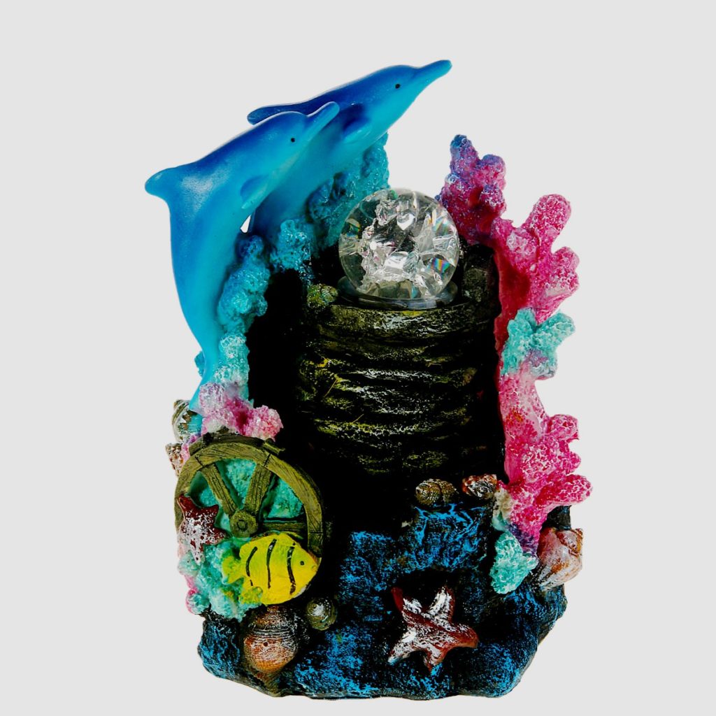 Model desktop dibuat dalam bentuk koral. Berbeda dalam dimensi kecil (50*30 cm) dan kehalusan. Tidak memakan banyak ruang kosong, jadi tidak ada masalah dalam memasangnya bahkan di ruangan kecil. Pencahayaan dan kabut menambah pesona khusus. Kerang dan tanaman hijau buatan digunakan sebagai dekorasi.
