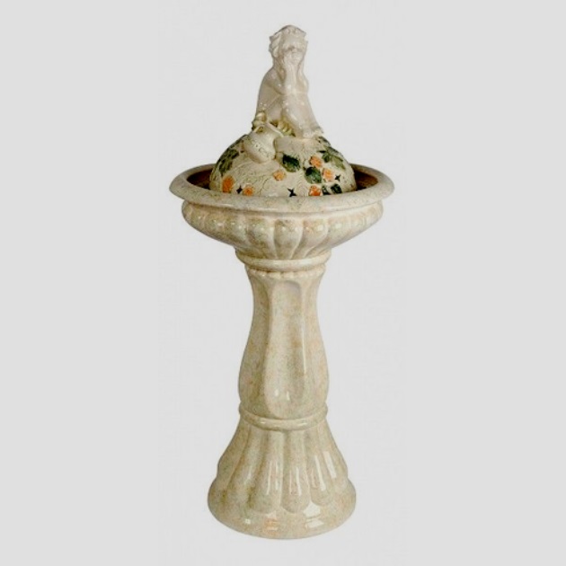 Patung anak laki-laki duduk di atas bola. Produk porselen hanya memiliki berat 19 kg. Semua tahapan pekerjaan seperti pengecoran, perakitan dan pengecatan dilakukan secara manual. Air, mengalir keluar dari kendi, mengalir ke bawah permukaan bola, yang memiliki pompa untuk mengedarkan cairan. Penyesuaian tekanan jet disediakan.